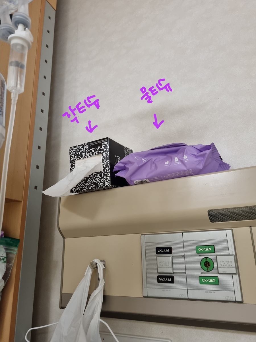 - 병실 내 내 자리에서 사용하는 휴지/ 물티슈/ 비닐봉지 로 흘린 것들 닦거나 할때 필요하다.